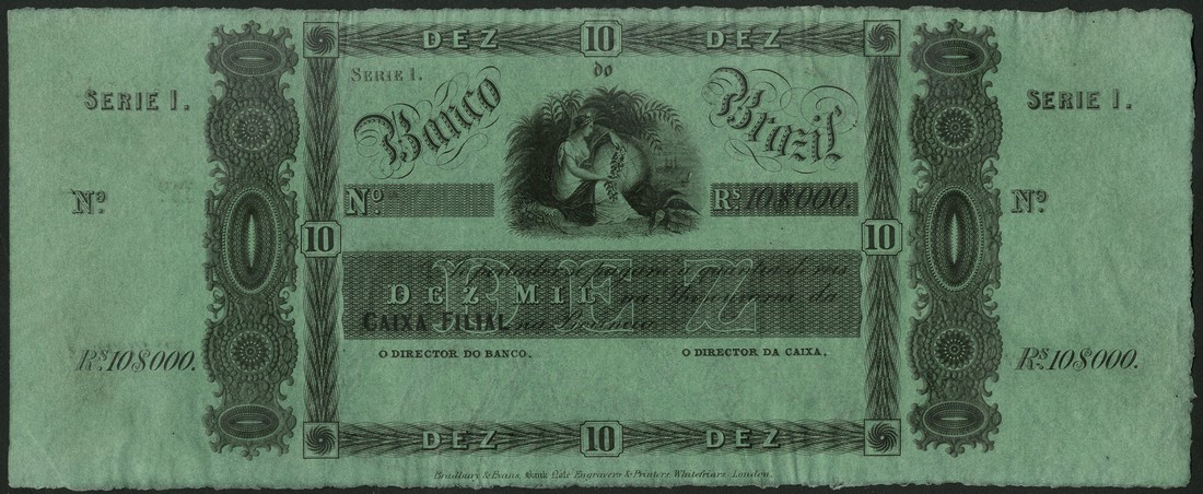 (†) Banco do Brazil, specimen 10 mil reis, ND (1856), black on green watermarked paper, woman with globe and garlands at top centre, counterfoils at left and right
