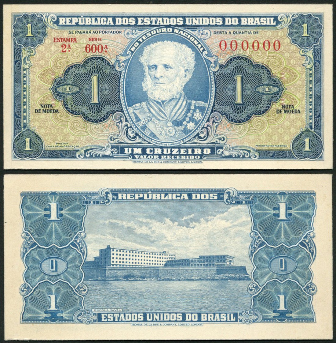 (†) Tresouro Nacional, Brazil, an obverse and reverse composite essay on card for a 1 Cruzeiro, ND (1944), Estampa 2A, Serie 600A, serial number 0000000, blue on multicoloured underprint, portrait of Marques de Tamandare at centre, value in guilloches on either side and in each corner, reverse naval school at centre, value in guilloches at left and right