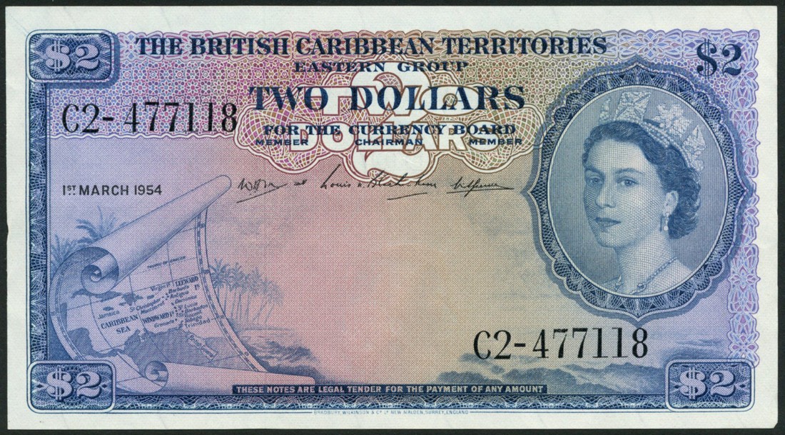 British Caribbean Territories, Currency Board, $2, 1 March 1954, serial number C2-477118, blue and lilac, map at left, Elizabeth II at right, reverse blue and white, arms