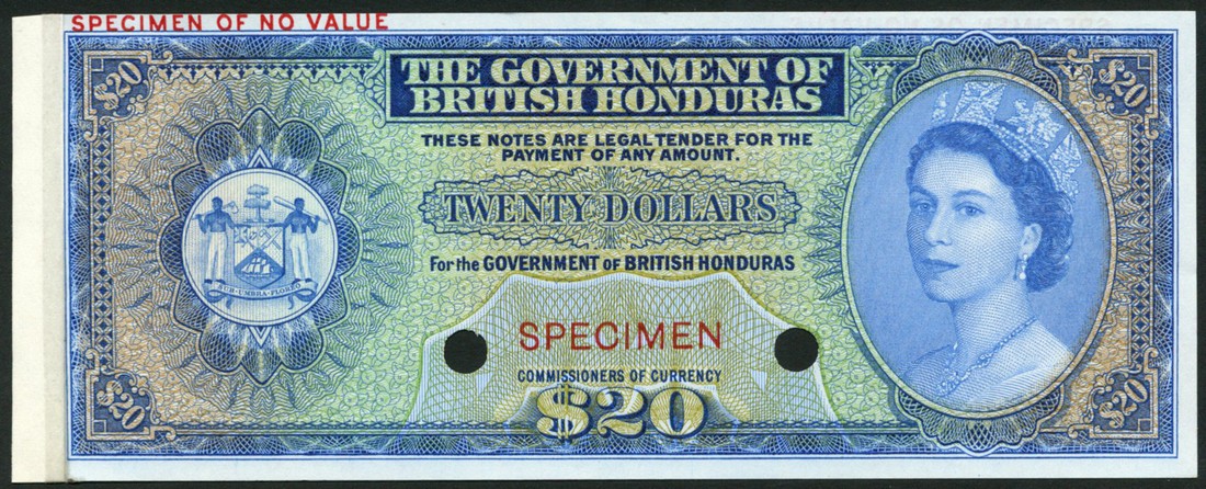 (†) The Government of British Honduras, a set of specimen colour trials of the ND (1953-73) Issue comprising $1, blue, green and yellow; $2, brown, purple and orange; $5, violet, brown and orange-pink; $10, olive-green, black and orange; and $20, blue, green and pale yellow, all Queen Elizabeth II at right, arms at left, reverse ornate guilloches, all overprinted SPECIMEN in red on obverse and reverse, two punch holes
