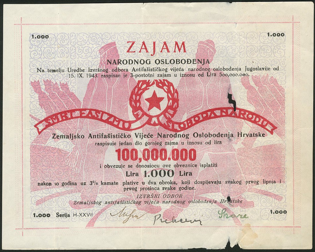 Croatian Anti-Fascist Government Authority, 1000 dinara, decree of 15 September 1943, series H-XXVII, serial number 31239, black text on pale blue and pink and red, soldiers in underprint at centre, red star within wreath at centre, three manuscript signatures below, reverse black and white text