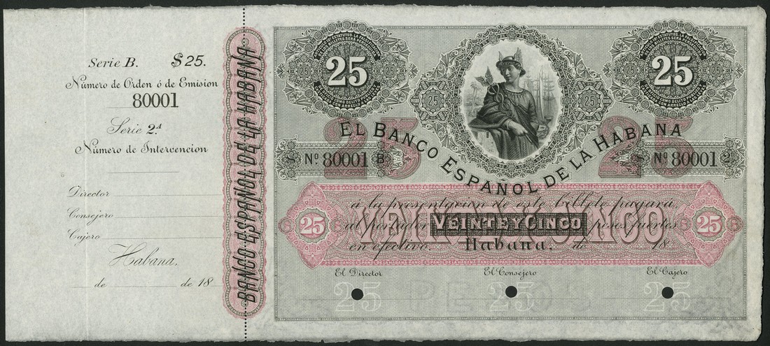 (†) El Banco Espanol de la Habana, specimen 25 pesos, ND (1872-91), serial number 80001, black on pink and green underprint, Mercury at top centre, flanked by values, counterfoil at left, three cancellation holes