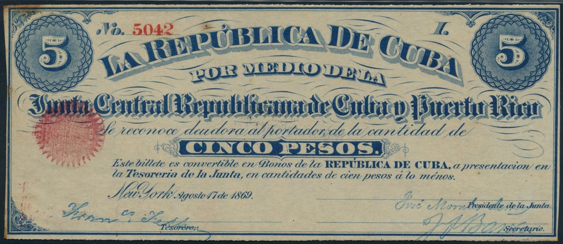 (x) La Republica de Cuba, 5 pesos, New York, 17 August 1869, red serial number 5042, uniface, blue, value at top left and right, red stamp at left