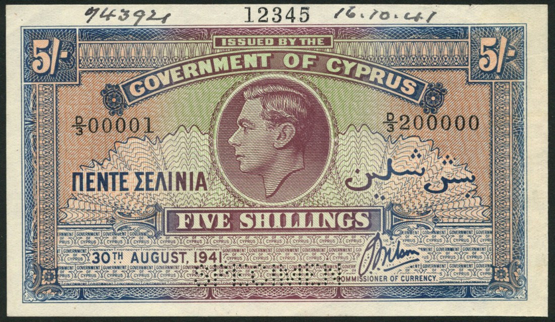 (†) Government of Cyprus, printer's archival specimen 5 Shillings, 30 August 1941, serial run D/3 00001 to D/3 200000, brown-violet and blue, portrait of King George VI at centre, value at upper left and right, reverse ornate guilloche, perforated SPECIMEN