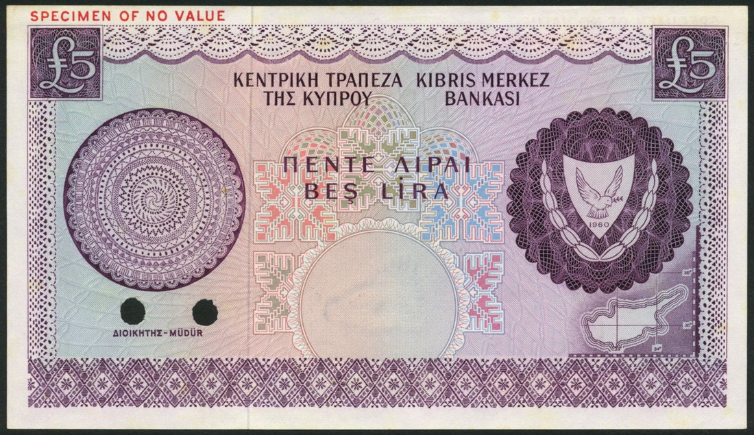 (x) Central Bank of Cyprus, colour trial £5, ND (1964-66 issue), no serial numbers, purple on multicoloured underprint, arms at right, map at low right, value at top left and right