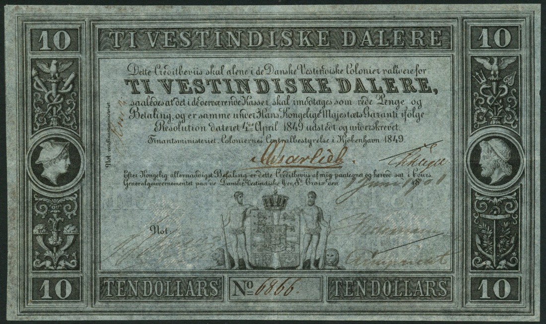 State Treasury, Danish West Indies, 10 dalere, L 4 April 1849, hand written date 1 June 1901, hand writtenserial number 6866, portrait of Mercury in circular frame at left, portrait of Zeus in circular frame at right, six signatures
