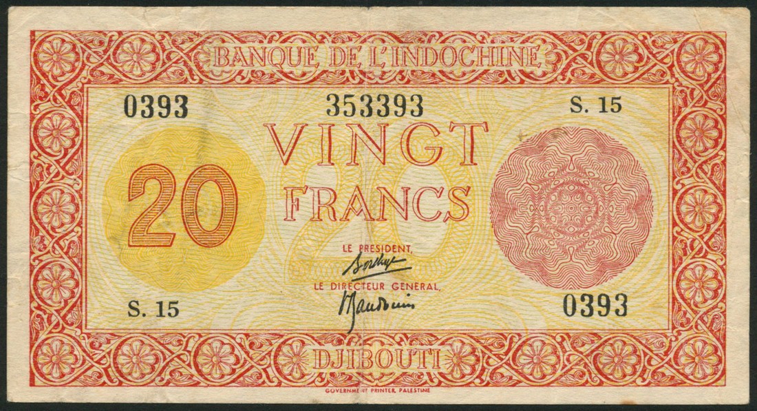 Banque de L'Indochine, Djibouti 20 francs, ND (19 February 194), serial number S15 0393, red on yellow underprint, reverse building with palm tree