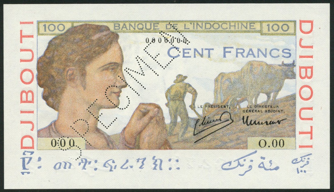 (x) Banque de l'Indo-Chine, Djibouti, specimen 100 francs, ND (1946), zero serial numbers, multicoloured, woman at left, farmer and plough at right, reverse allegorical scene of Industry