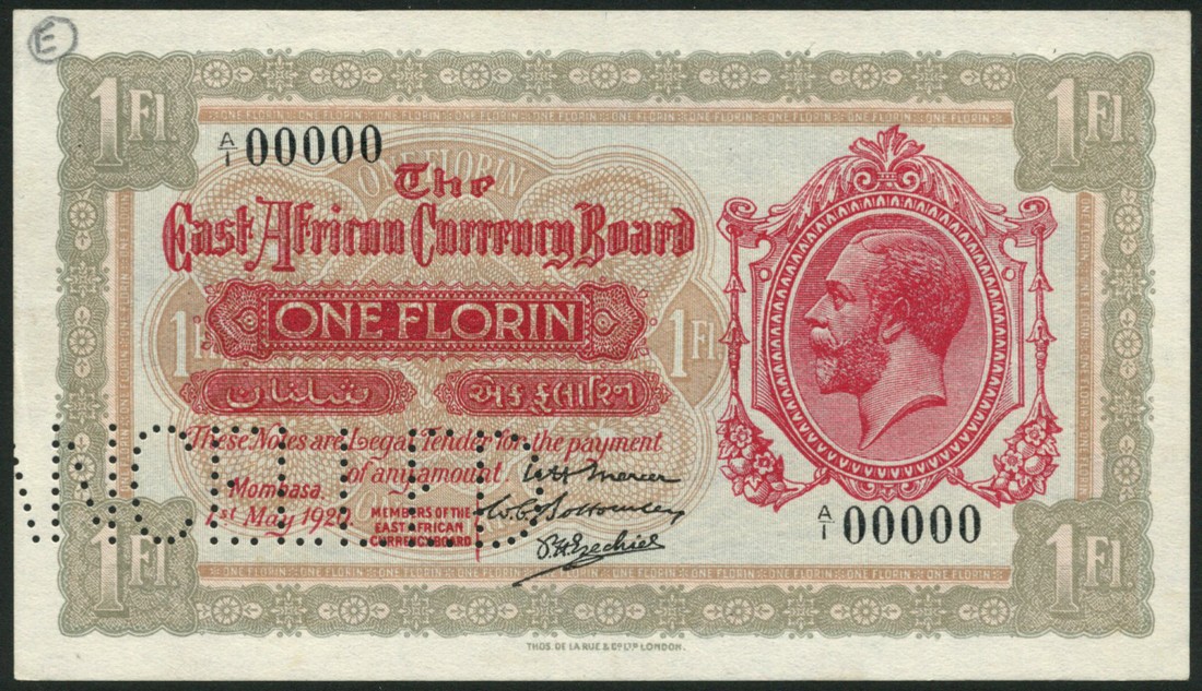 (†) The East African Currency Board, specimen 1 Florin, 1 May 1920, serial number A/1 00000, olive-brown and red, portrait of King George V in decorated frame at right, value in each corner, reverse blue, hippopotamus in ornate frame at centre, value in guilloches at left and right, perforated CANCELLED