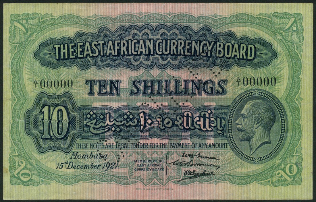 (†) The East African Currency Board, specimen 10 Shillings, 15 December 1921, serial number A/1 00000, three signatures at lower right, blue-black on green underprint, portrait of King George V at lower right, value at lower left, reverse green, lion at centre, value in each corner and set in ornate guilloches at left and right, perforated CANCELLED