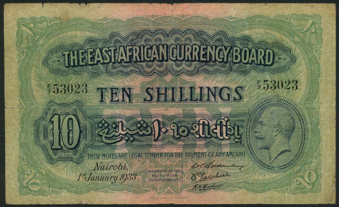 The East African Currency Board, 10 Shillings, 1 January 1933, Nairobi, serial number F/7 53023, blue black on green, portrait of King George V at right, lion at centre on reverse