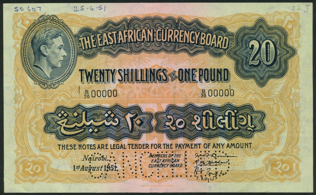 (†) The East African Currency Board, specimen 20 Shillings or 1 Pound, 1 August 1951, serial number B/20 00000, four signatures at lower right, blue-black on yellow and orange underprint, portrait of King George VI at upper left, value at upper right, reverse ochre, lion at centre, value in each corner and set in ornate guilloches at left and right, perforated CANCELLED