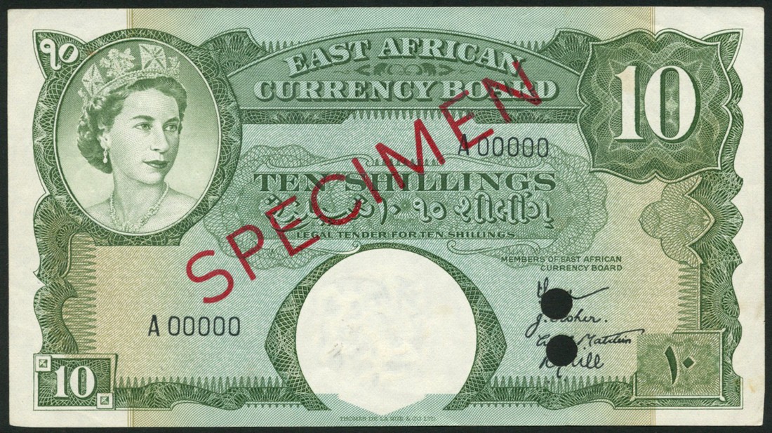 (†) The East African Currency Board, specimen 5 Shillings, ND (1958-60), no serial numbers, no signatures, brown on multicoloured underprint and specimen 10 Shillings, ND (1958-60), serial number A00000, four signatures at lower right, green on multicoloured underprint, both portrait of Queen Elizabeth II at upper left, value at upper right, reverse plants in a geometric design, value in each corner, both overprinted SPECIMEN in red with two red De La Rue specimen ovals on obverse and reverse, one or two punch holes