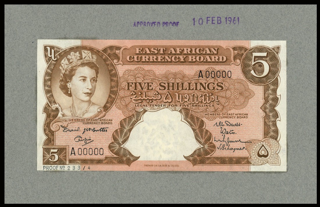 (†) The East African Currency Board, an obverse proof on board for a 5 Shillings, ND (1961-63), serial number A 000000, three signatures including E.B. David at lower left, four signatures at lower right, brown on multicoloured underprint, portrait of Queen Elizabeth II at upper left, value at upper right,