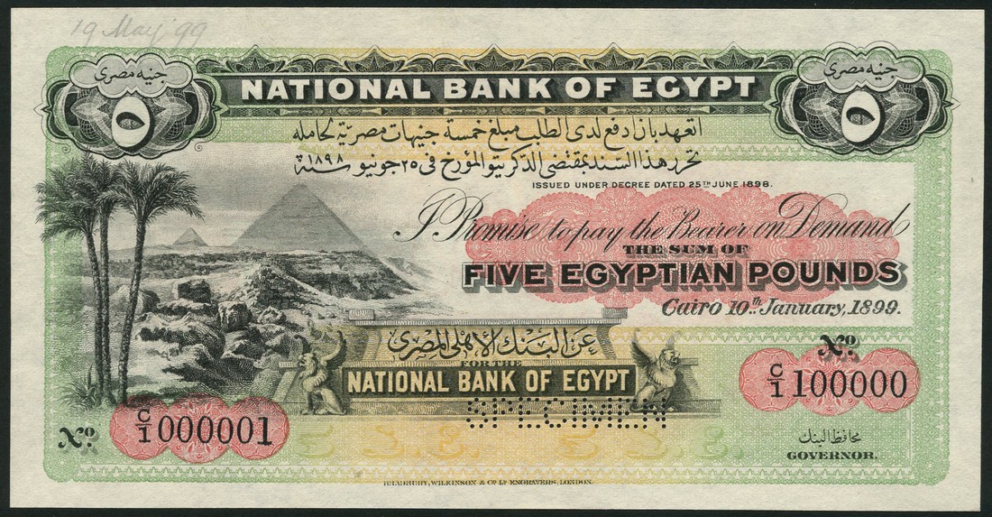 (†) National Bank of Egypt, specimen 5 pounds, ND (1899), serial number C/1 000001-C/1 100000, blue, pink and orange, the pyramids of Giza at left, value at top left and right, reverse red, value at left and right