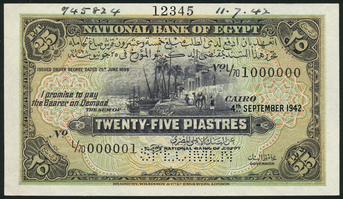 (†) National Bank of Egypt, printer's archival specimen 25 Piastres, 4 September 1942, serial number run L/70 000001 to L/70 100000, no signature, blackish purple on pale green and multicoloured underprint, banks of the Nile at centre, value in each corner, reverse deep blue, light blue and orange, value in western and Arabic numerals set in guilloches and ornate pattern, perforated SPECIMEN