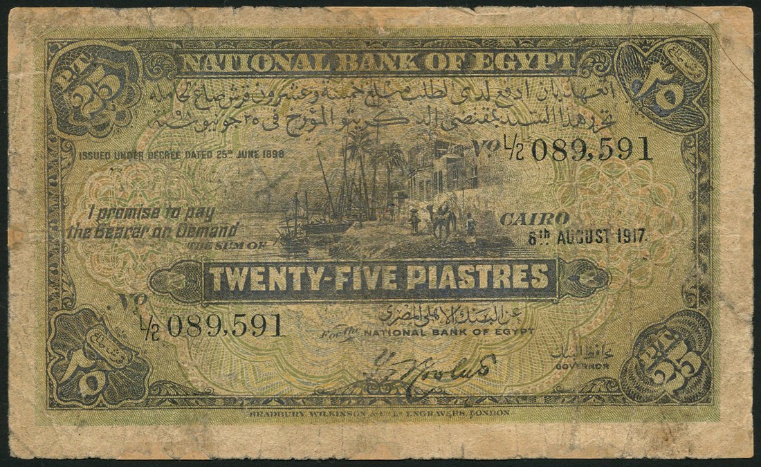 National Bank of Egypt, 25 piastres, 1917, purple on multicolour underprint, the banks of the Nile at centre