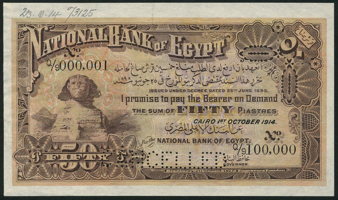 (†) National Bank of Egypt, printer's archival specimen 50 Piastres (2), 1 October 1914 and 2 October 1914, serial number runs Q/9 000,001 to Q/9 100,000 and Q/10 000,001 to Q/10 100,000 respectively, no signature, brown on multicoloured underprint, sphinx at left, value at upper right and lower left, reverse blue on pale green and pink underprint, value in western and Arabic numerals set in guilloches and ornate pattern, perforated CANCELLED
