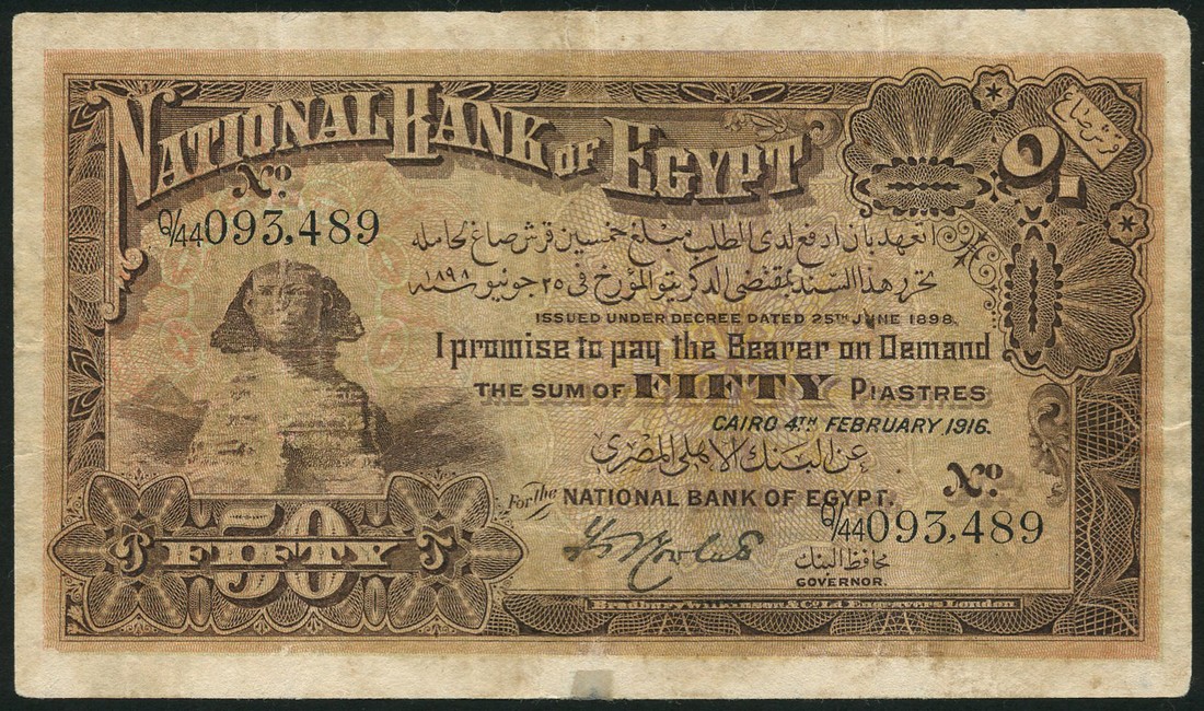 (x) National Bank of Egypt, 50 piastres, 4 February 1916, serial number Q/44 093,489, brown, Sphinx at left, denomination in Arabic top right corner and in Western bottom right corner