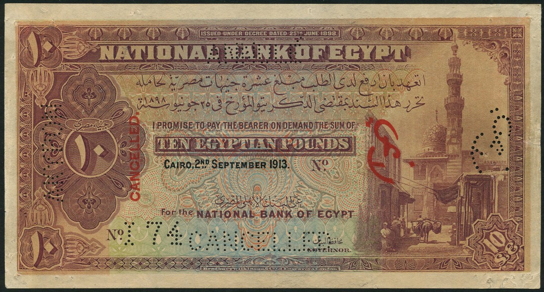 National Bank of Egypt, specimen £10, 2 September 1913, no serial numbers, brown and multicoloured, street scene and the Mosque of Qayetbay at right, value at left, reverse brown