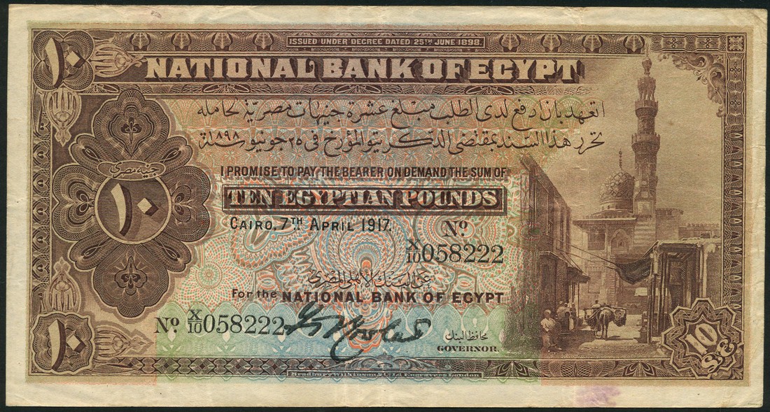 National Bank of Egypt, £10, 7 April 1917, serial number X/10 058222, purple-brown and multicoloured, the Mosque of Qayetbay and street scene at right, value at left, Rowlatt signature, reverse brown
