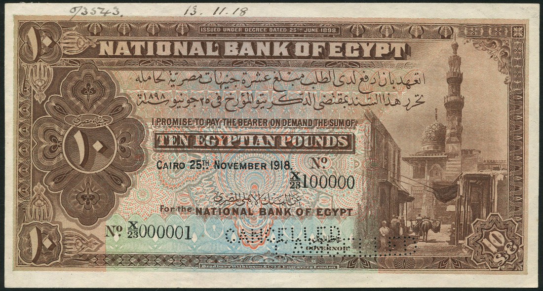 (†) National Bank of Egypt, printer's archival specimen 10 Pounds (2), 25 November 1918 and 26 November 1918, serial number runs X/23 000001 to X23 100000 and X/24 000001 to X/24 050000 respectively, no signature, brown and multicoloured, Cairo mosque and street at right, value in Arabic numerals in guilloche at left, reverse ornate geometric pattern, value in each corner, perforated CANCELLED
