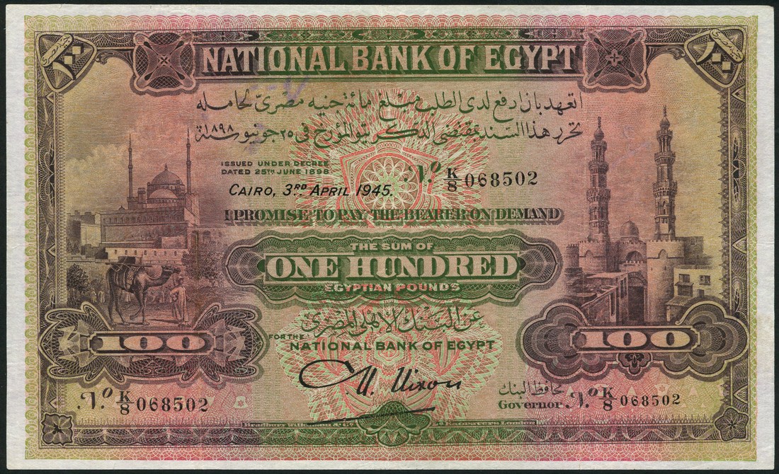 (x) National Bank of Egypt, £100, 3 April 1945, serial number K/8 068502, multicolour, Citadel of Cairo at left, Mosque at right, reverse dhow and Island of Philae