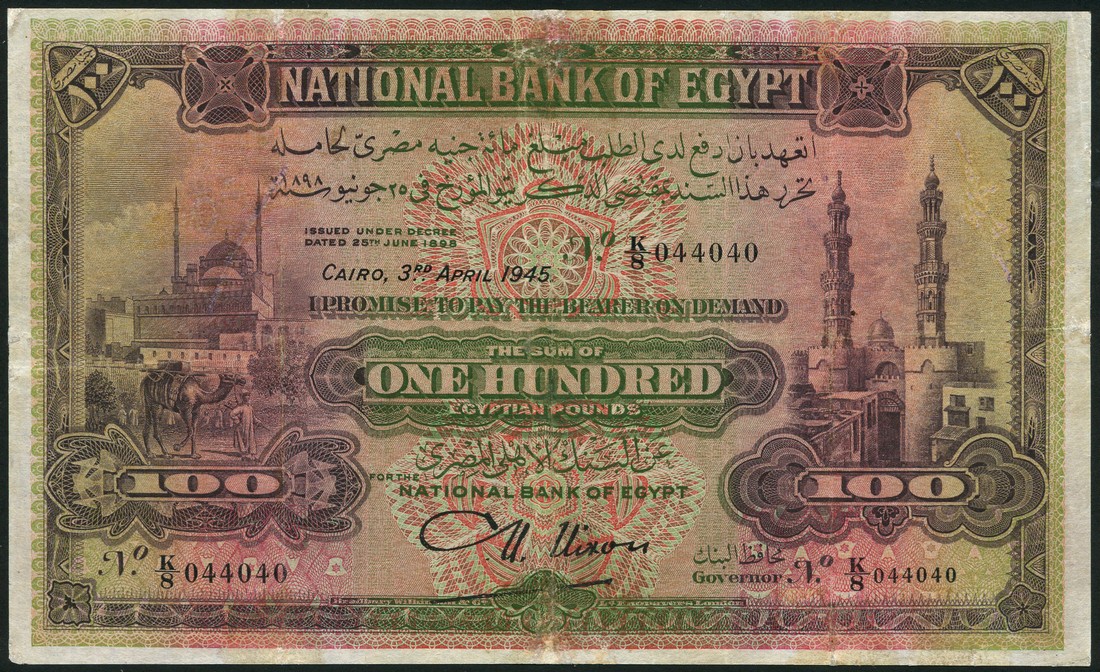 (x) National Bank of Egypt, £100, 3 April 1945, serial number K/8 044040, multicolour, Citadel of Cairo at left, Mosque at right, reverse dhow and Island of Philae