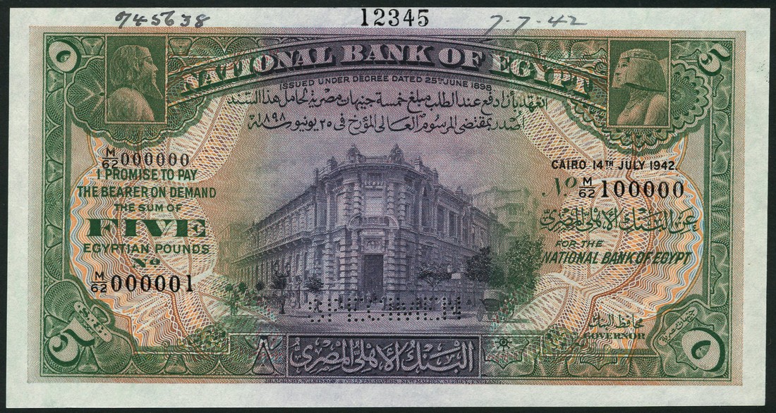 (†) National Bank of Egypt, printer's archival specimen 5 Pounds (2), 14 July 1942 and 5 January 1945, serial number runs M/62 000001 to M/62 100000 and M/92 000001 to M/92 100000 respectively, no signature, green, blackish purple and multicoloured, National Bank building at centre, value in each corner, reverse blue and red on green and orange underprint, palm trees and building at centre, value in guilloches at right and left, perforated SPECIMEN