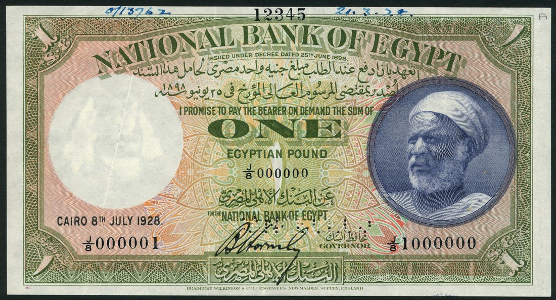 (†) National Bank of Egypt, specimen £1, 3 January 1926, serial number J/8 000001-J/8 1000000, green and pink, Fellah 'Edrees' in green circular frame at right, reverse violet and white, the Mosque of al-Mansour Seif el-Dein Qalawun at Bein-al-Qasrein