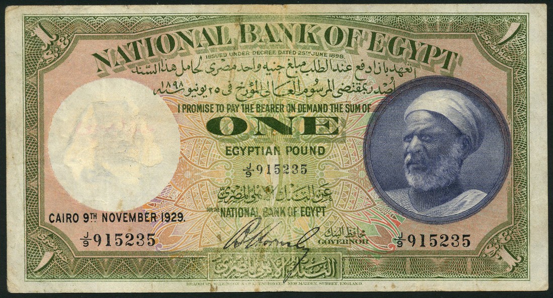 (x) National Bank of Egypt, £1, 9 November 1929, serial number J/9 915235, green and pale pink, Fellah in blue-violet circular vignette at right, Hornsby signature, reverse violet, Mosque at centre