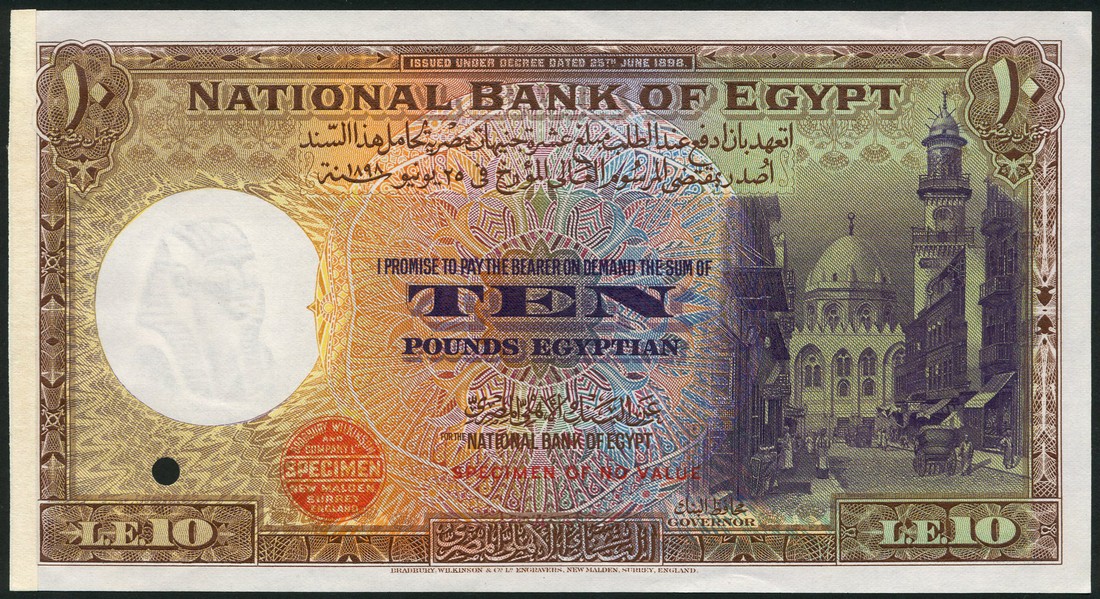 (†) National Bank of Egypt, specimen 10 Pounds, ND (1931-51), no serial numbers, no signature, brown, violet and multicoloured, the Mosque of Qala'an and street scene at right, value in each corner, reverse blue, green and pink, farm scene at left, palm trees at centre, red Bradbury Wilkinson specimen seal at lower left, overprinted SPECIMEN OF NO VALUE on obverse, one punch hole