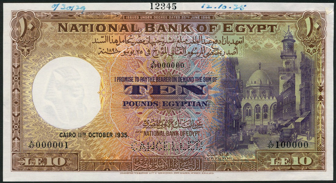(†) National Bank of Egypt, printer's archival specimen 10 Pounds, (2), 11 October 1935 and 12 October 1935, serial number runs X/47 000001 to X/47 100000 and X/48 000001 to X/48 100000, no signature, brown, violet and multicoloured, the Mosque of Qala'an and street scene at right, value in each corner, reverse blue, green and pink, farm scene at left, palm trees at centre, perforated CANCELLED