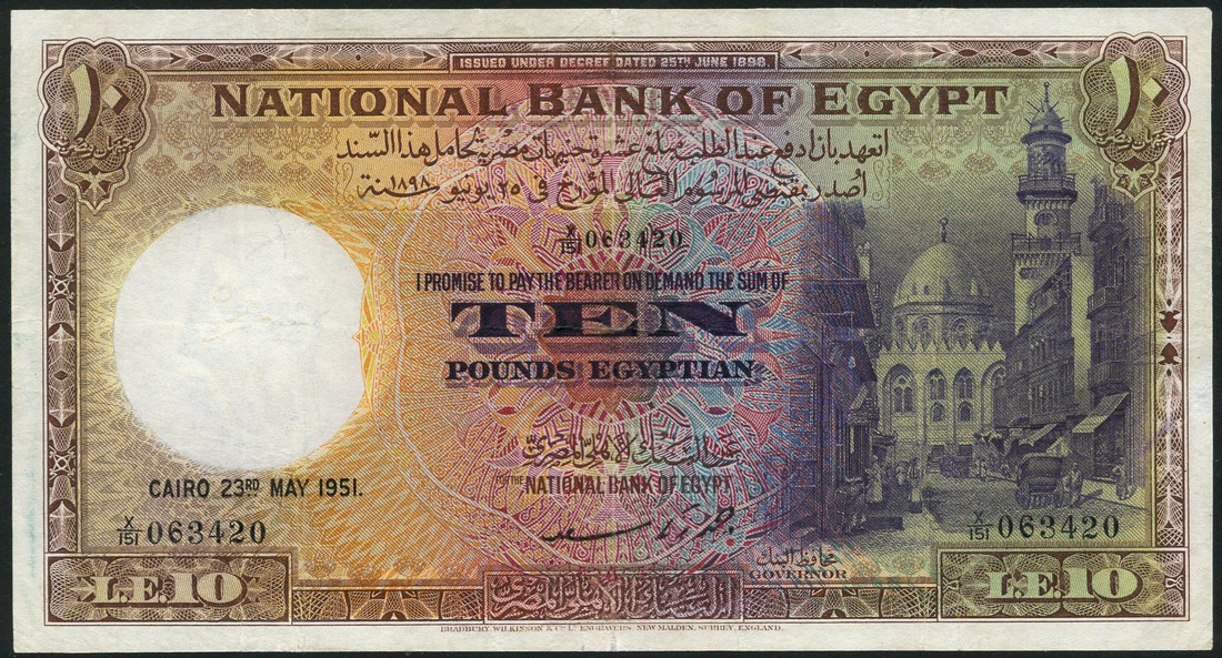 (x) National Bank of Egypt, £10 (2), 16 May 1939 and 23 May 1951, serial numbers X/54 037121 and X/151 063420, brown, yellow-green and multicolour, Mosque of Sultan Qala'un and street scene in Cairo, reverse green and pale pink, man and water buffalo at left, palm trees at centre