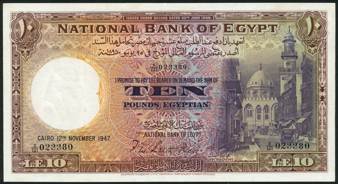 (x) National Bank of Egypt, £10, 12 November 1947, serial number X/121 023380, brown, yellow-green and multicolour, Mosque of Sultan Qala'un and street scene in Cairo, reverse green and pale pink, man and water buffalo at left, palm trees at centre