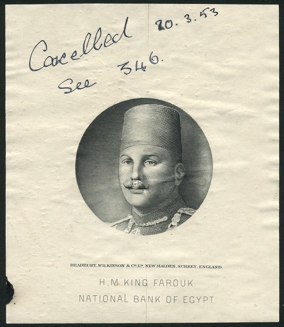 (Similar to portraits on the issues of the late 1940's and early 1950's), manuscript 'Cancelled20.3.53'. A lovely Bradbury Wilkinson engraving and dated during momentous changes in Egypt