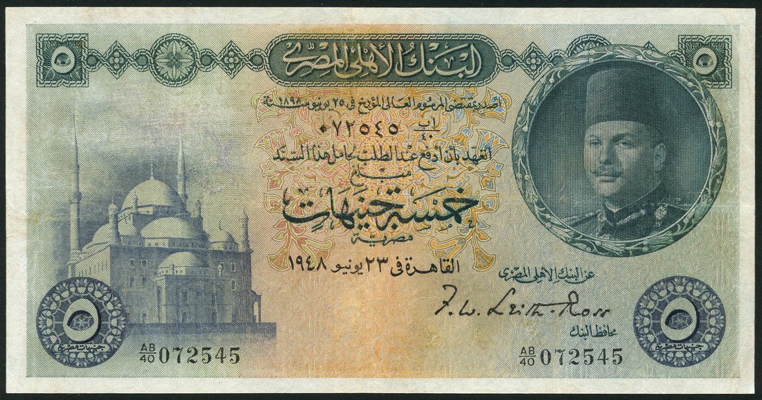 (x) National Bank of Egypt, £5, 1948, serial number AB/40 072545, £5, 1951, serial number AB/59 015186. blue green, violet and brown, portrait King Farouk at left, Citadel of Cairo at right, reverse allegorical figures at centre