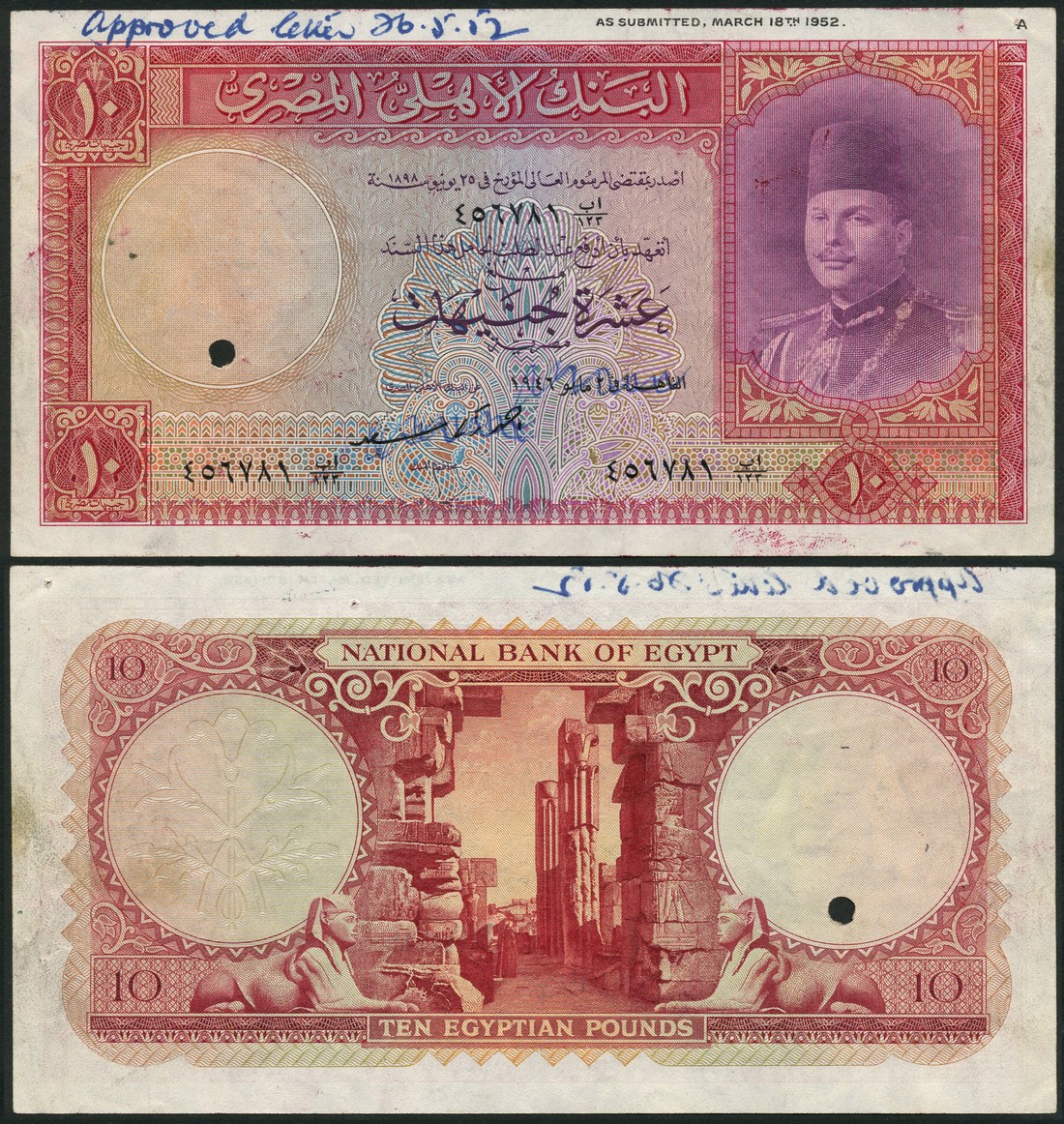 (Pick and Hanafy unrecorded), glue traces, printed annotation "as submitted, March 18th 1952.' and ink annotation 'approved letter 26. 5. 52' both in top margin, signature and date both deleted in blue ink, pin hole, otherwise good extremely fine. Of the utmost rarity, probably unique, note prepared for issue but never released, as King Farouk overthrown in the revolution on 23 July 1952