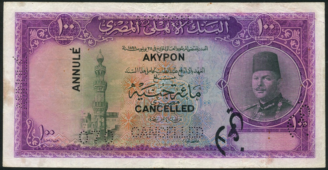 (x) National Bank of Egypt, cancelled £100, 1951, no serial number, purple on multicolour, minaret at left and portrait of King Farouk at right, reverse mosque, black stamped and perforated ANNULE, AKYPON, CANCELLED, and in Arabic, also perforated number 070 bottom centre right,