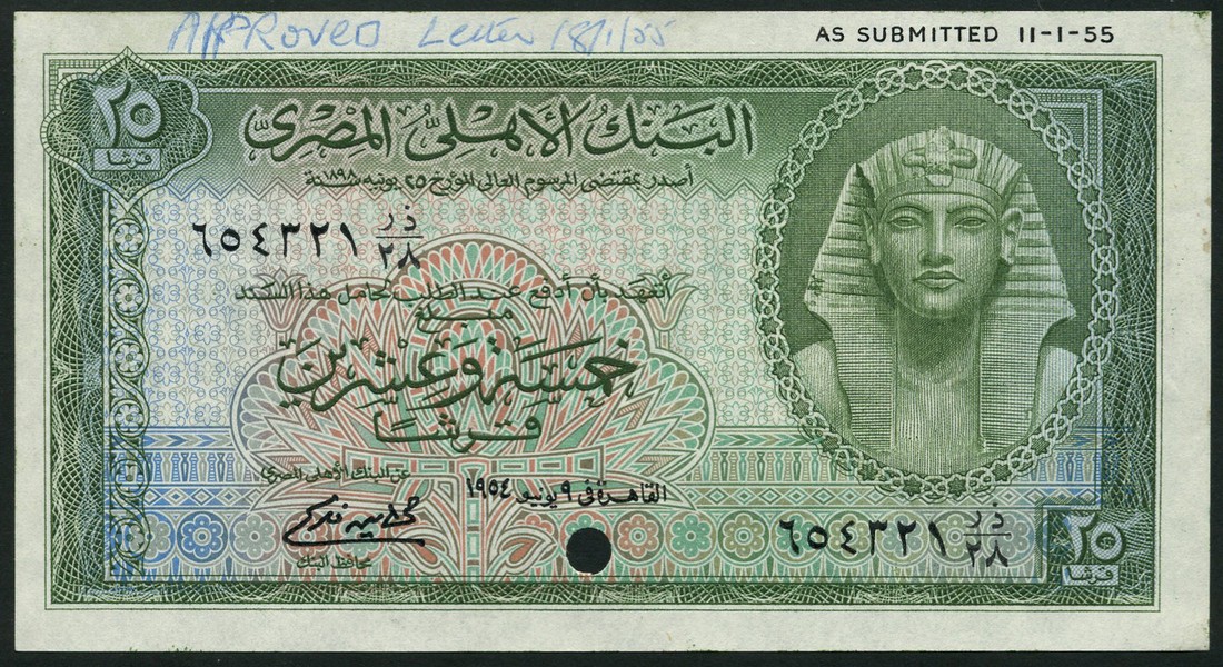 (†) National Bank of Egypt, specimen proof 25 Piastres (2), 1954 and 1957, serial numbers 123456, green on multicoloured underprint, Tutankhamen at right, reverse Mosque of Abu al-Abbas al-Morsy in Alexandria, one punch hole