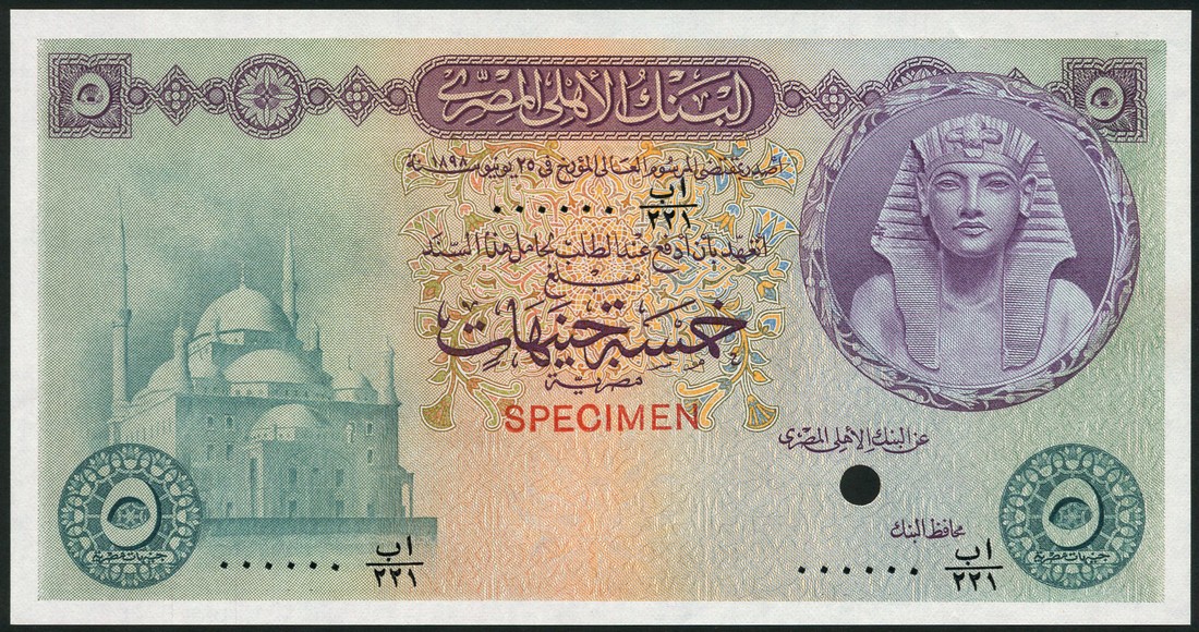 (†) National Bank of Egypt, specimen colour trial 5 Pounds, ND (1952-60), zero serial numbers, no signature, purple and green on orange underprint, Tutankhamen at upper right, the Mosque of Mohammad Ali at left, reverse brown, the god Nilos and his thirteen sons, overprinted SPECIMEN in red on obverse and reverse, one punch hole