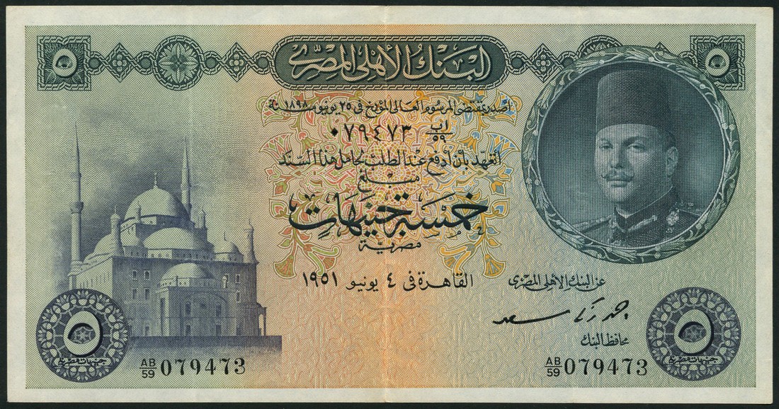 (x) National Bank of Egypt, £5, 1951, serial number AB/59 079473, grey green on multicolour, portrait King Farouk at right, mosque at left, reverse allegorical figures, also £5 (2), 1959, dark green, grey blue and pink, Tutankhamen facing at right, mosque at left, reverse spectacular allegorical figures