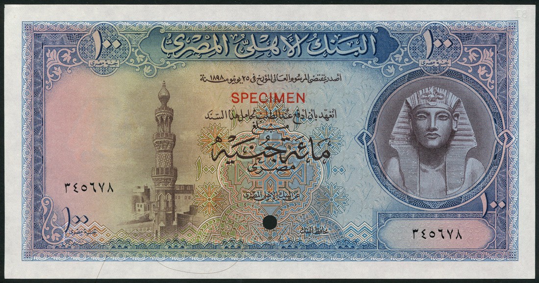 (†) National Bank of Egypt, specimen colour trial 100 Pounds, ND (1952), serial number 876543, no signature, black and blue on pink and multicoloured underprint, Tutankhamen at right, Mosque of Qadi Yahya Zein al-Din at left, reverse olive-green on pink underprint, tomb of Sultan al-Ashraf Qatbay at the Qarafa cemetery of the Mamluks overprinted SPECIMEN in red on obverse and reverse, one punch hole