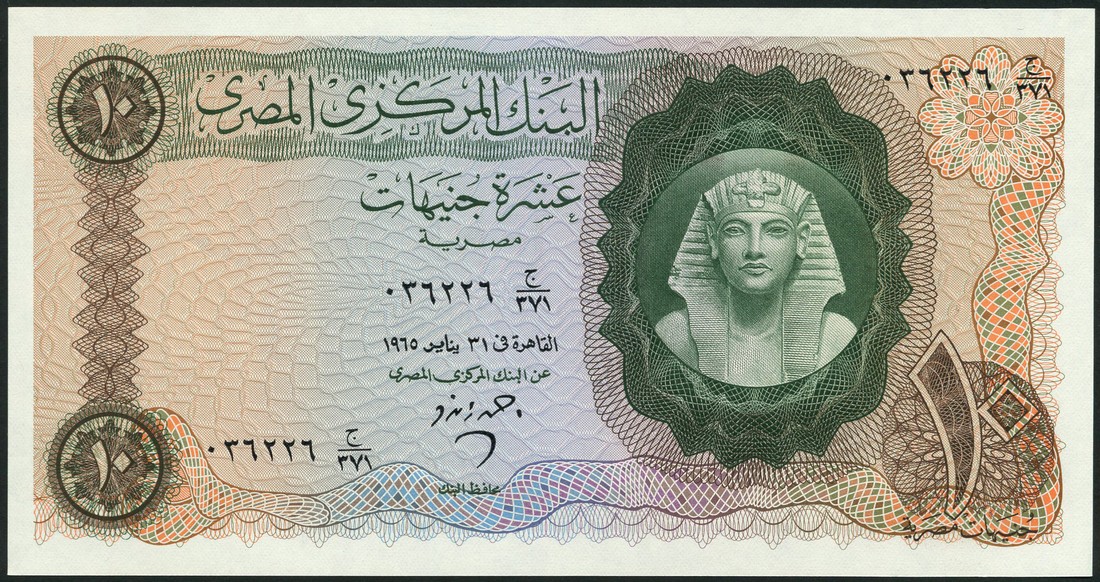 (x) Central Bank of Egypt, 10 pounds (10), 1960, serial numbers 036226, 036227, 036228, 036229 036230, 036231, 036232, 036233, 036234, 036235, a particularly lovely and colourful group, Tutankhamen's mask at right, reverse denomination in figures and text, consecutive serial numbers unusual for a group of this size