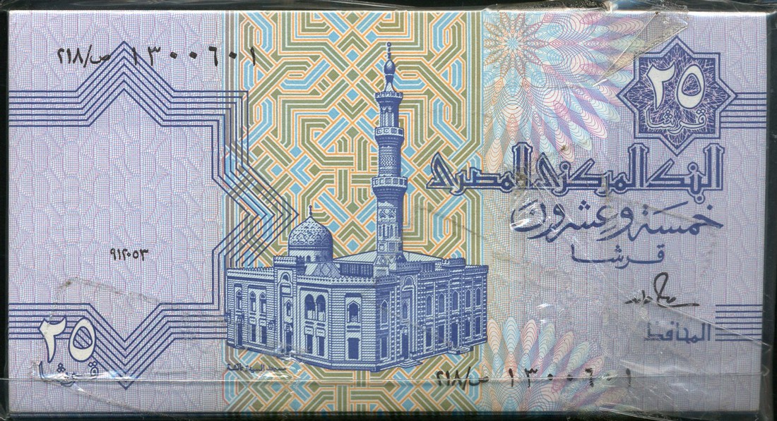 (x) Central Bank of Egypt, 25 piastres (100), 1990 issue, purple on mauve and multicolour underprint, Sayida Aisha mosque at centre