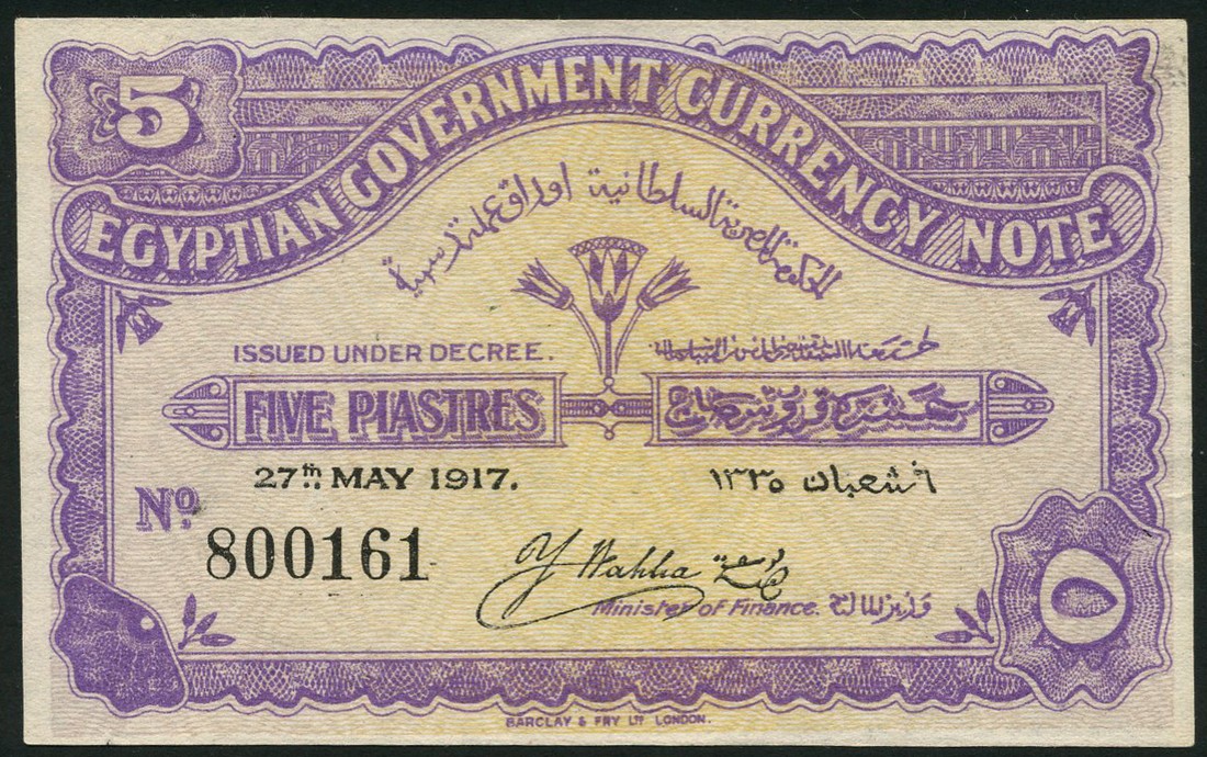 Egyptian Government Currency note, trial 5 piastres, 27 May 1917, serial number 800161, lilac and pale green,Youssef Wahba signature, reverse green, ruins of the Temple of Isis