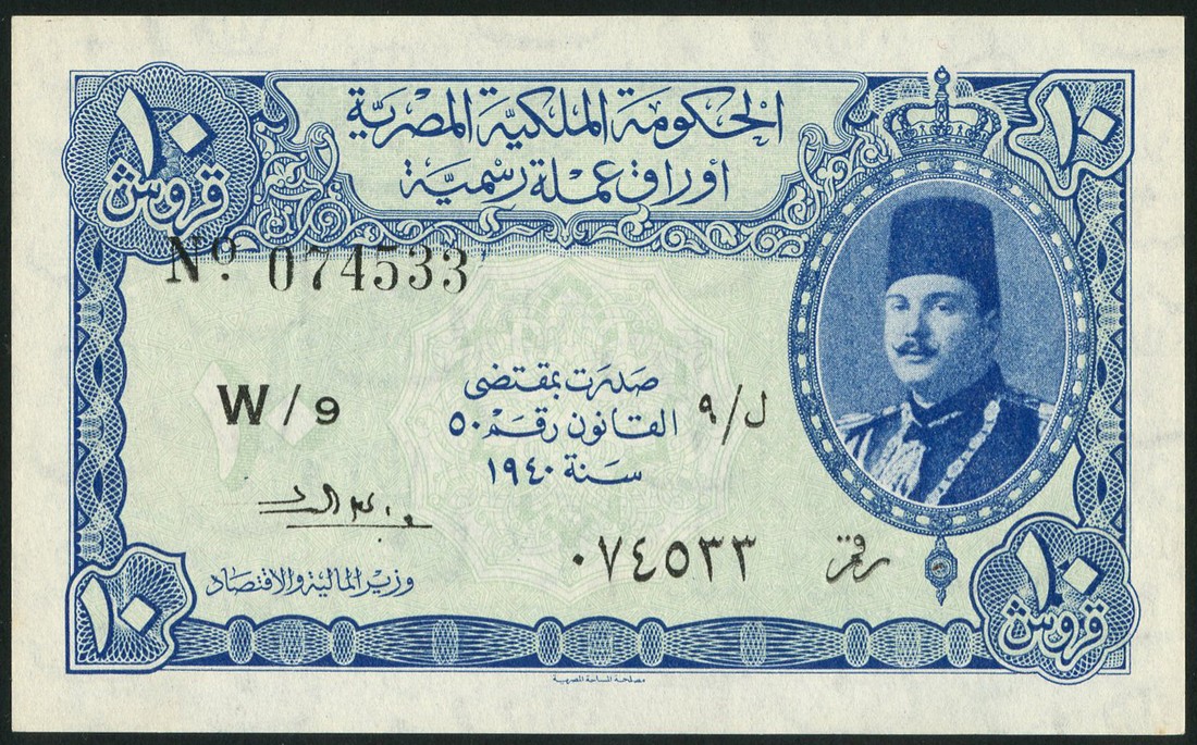 Egypt Government Currency note, 10 piastres (5), ND (1940 issue), serial numbers W/9 074529-33, blue on pale green underprint, King Farouk at right, value at each corner, signature title 'Minister of Finance and Economy' on reverse