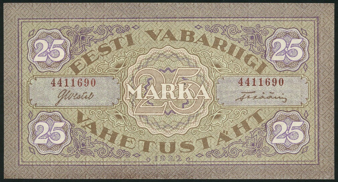 Republic Treasury, 25 marka exchange notes (3), 1922, serial numbers 4071478 (orange), 4323543 (red) and 4411690 (brown), light brown on olive and violet