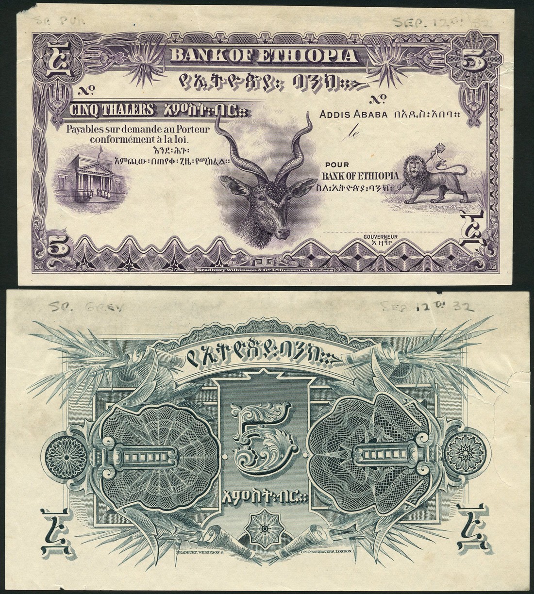 (†) Bank of Ethiopia, obverse and reverse uniface proof 5 Thalers, ND (c1932), violet and white, Greater Kudu head at lower centre, bank building at left, lion at right, reverse blue-grey, value at centre, guilloches at left, palm fronds in each corner