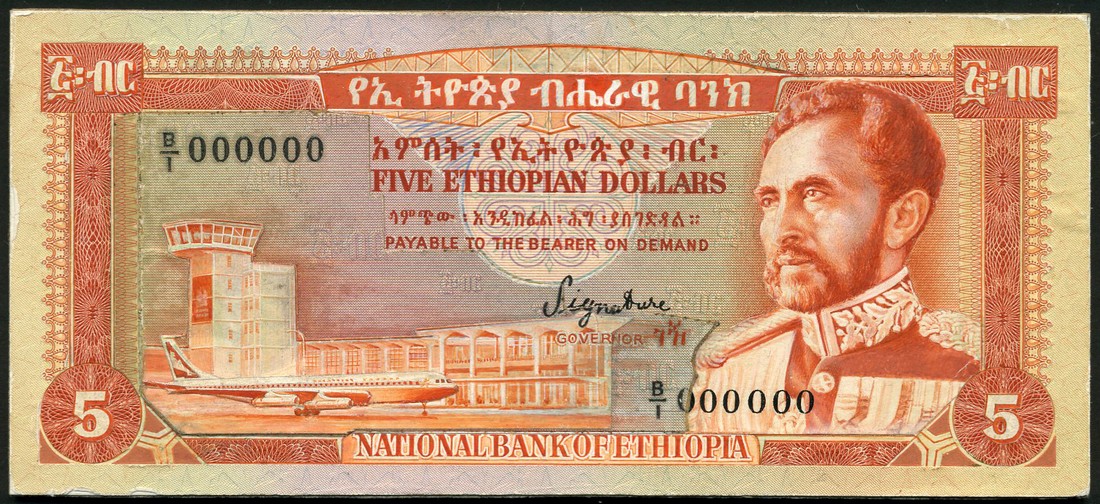 (†) National Bank of Ethiopia, obverse composite essay on card for a 5 Dollars, ND (c1966), serial number B/1 000000, deep orange on sage green underprint, Emperor Haile Selassie at right, Bole Airport, Addis Ababa at centre left